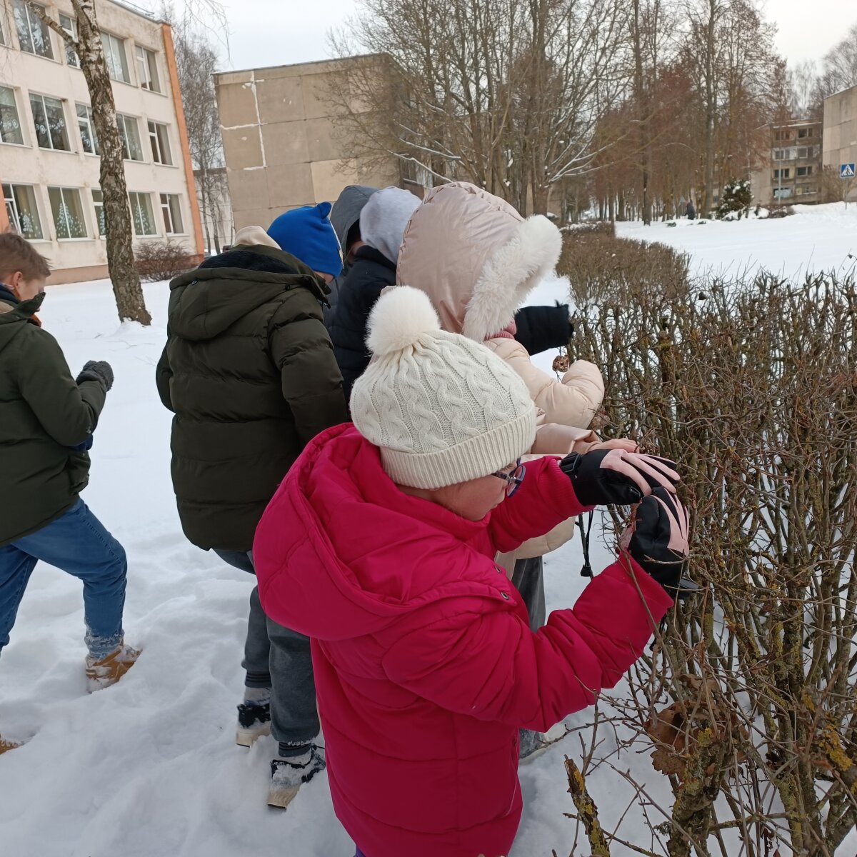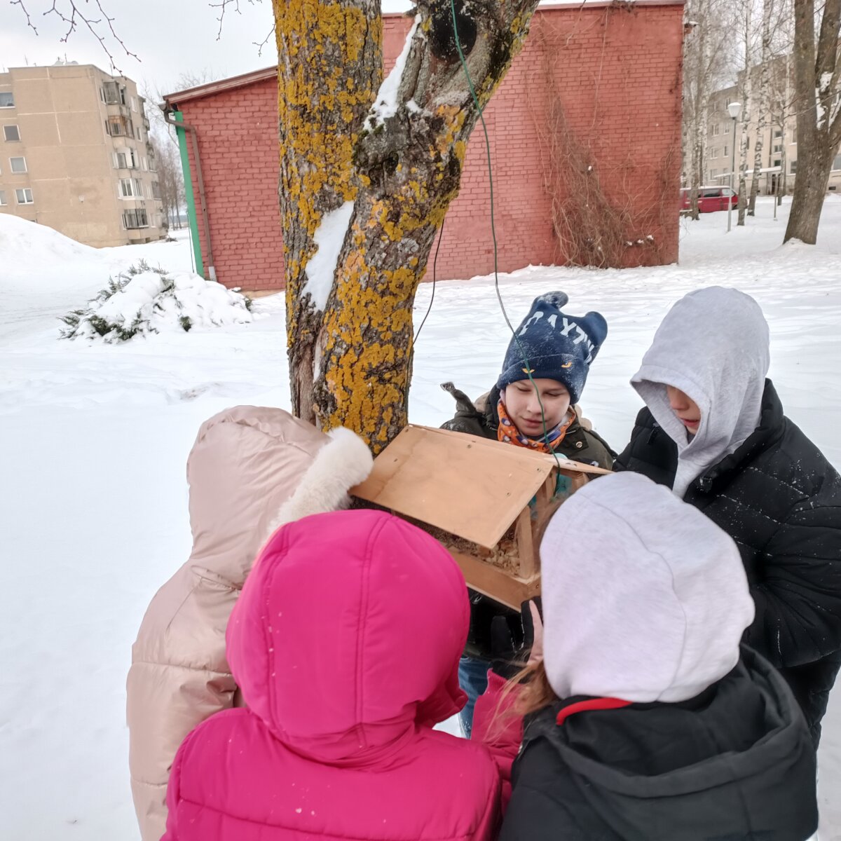 Vaikai pagamino paukšteliams ledinius skanėstus, kuriuos pakabino mokyklos teritorijoje ant krūmų bei žemai pasiekiamų šakų, o dalį išdėliojo ant palangių. Veiklos metu mokiniai stebėjo aplinką, dalijosi pastebėjimais ir svarstė, kokie paukščiai galėtų atskristi pasivaišinti: zylės, žvirbliai ar sniegenos.