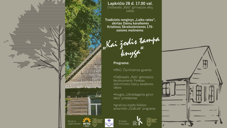 Maloniai kviečiame lapkričio 28 d. 17.00 val. į tradicinį Didžiasalio „Ryto“ gimnazijos renginį „Laiko ratas“, skirtą Dainų karalienės Kristinos Skrebutėnienės 170-osioms metinėms „Kai žodis tampa knyga“.