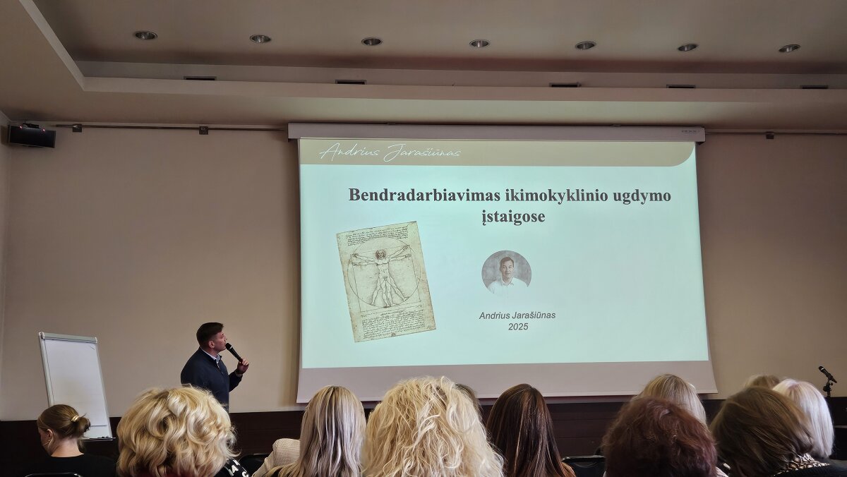 Renginio dalyviai taip pat turėjo galimybę išklausyti paskaitą „Bendradarbiavimas ikimokyklinio ugdymo įstaigose“, kurią vedė Andrius Jarašiūnas – mokymų treneris ir asmeninis konsultantas, taikantis įvairius metodus: koučingą, NLP, hipnozę bei Geštalto terapijos elementus.