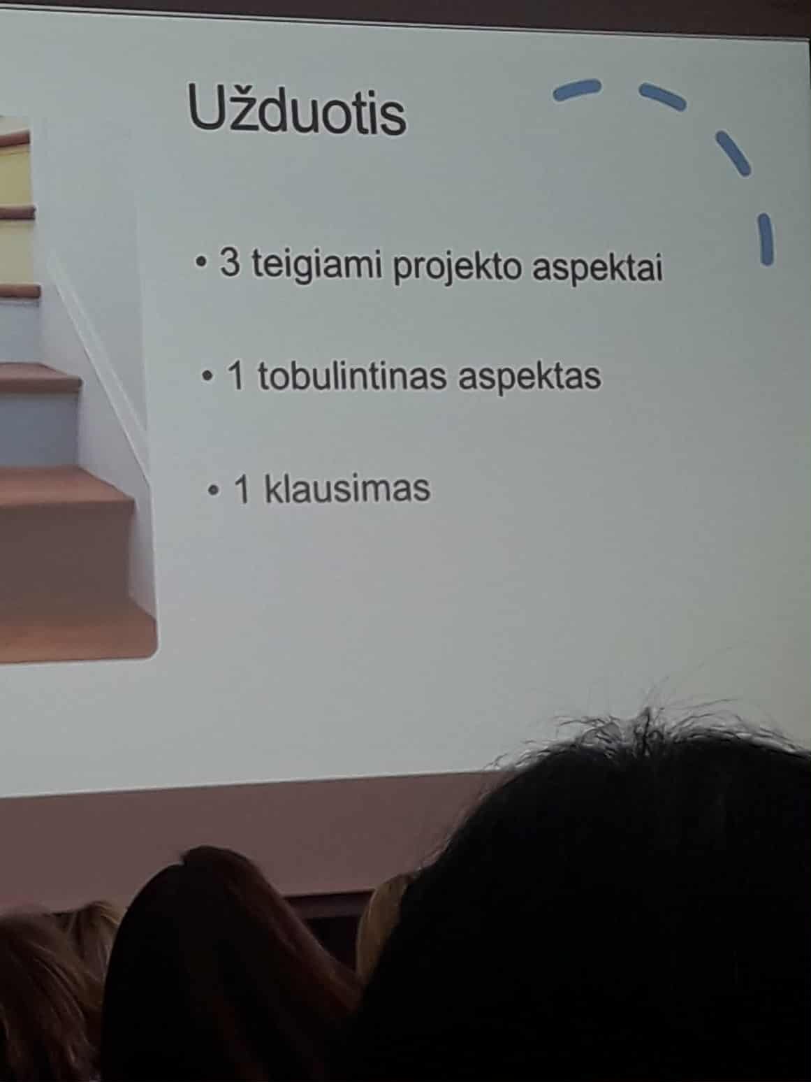Dirbdami mažesnėse grupėse, dalyviai apibendrino pirmojo etapo rezultatus: išskyrė tris stipriąsias projekto puses, vieną tobulintiną aspektą ir suformulavo klausimą tolimesniam etapui.