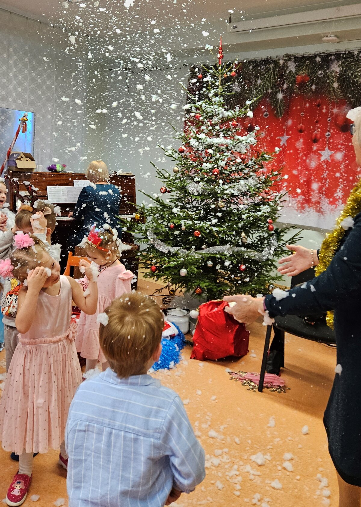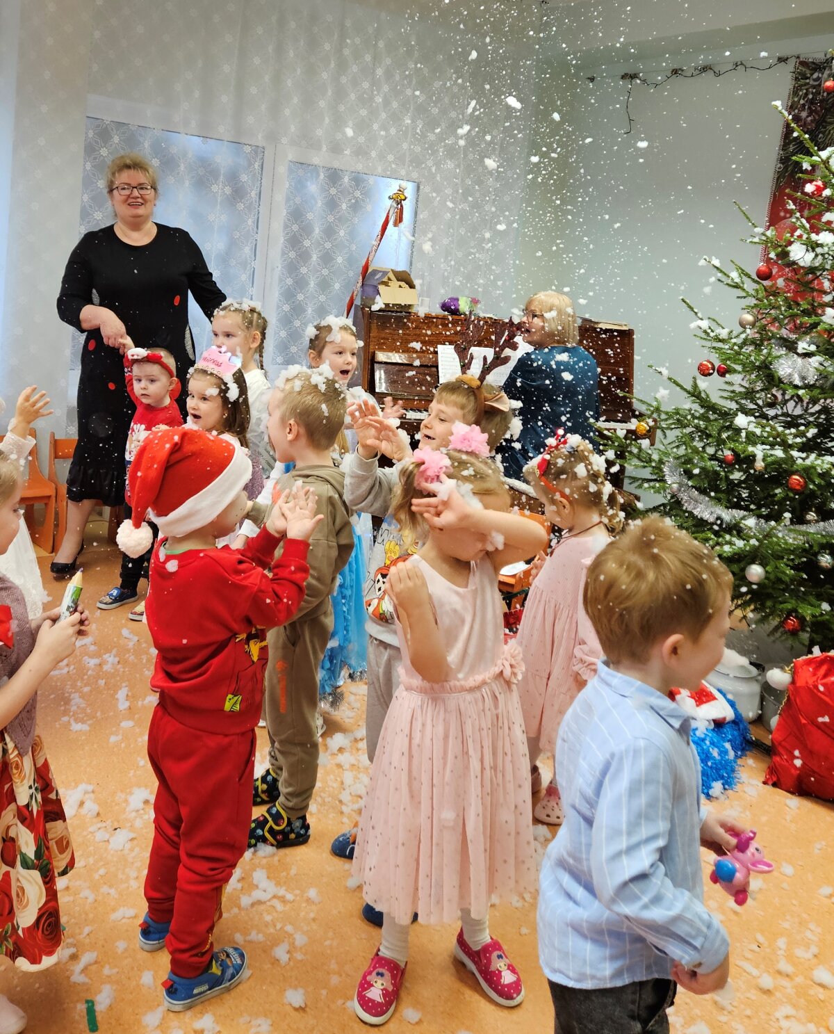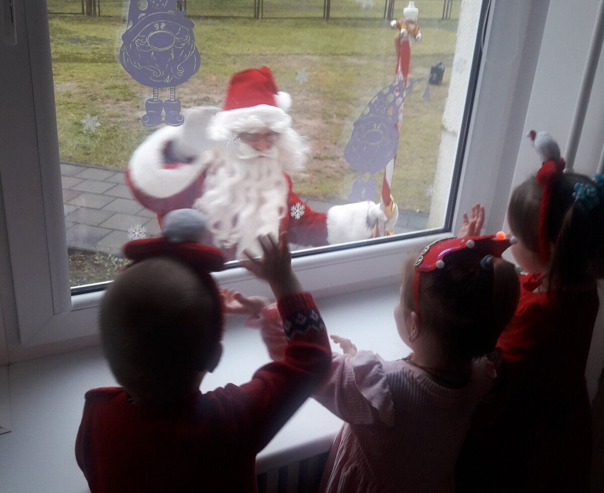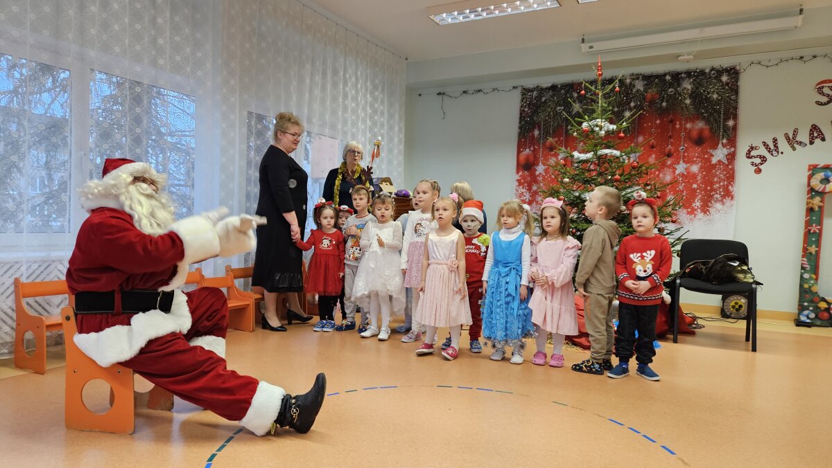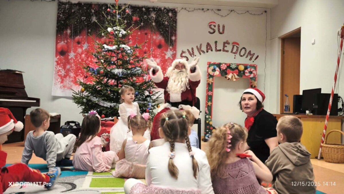 Darželio vaikučiai sulaukė ypatingos staigmenos – netikėtai pro langą jie išvydo baltą Meškiną, kuris pranešė džiugią naujieną apie atvykstantį Kalėdų Senelį. Vaikų džiaugsmui netrukus darželio aikštelėje pasirodė ir pats Senelis – linksmai pamojavęs, jis lyg stebuklas trumpam dingo, o netrukus jau lankėsi grupėse. Kalėdų Senelis šiltai pasveikino vaikučius su artėjančiomis šventėmis, pavaišino saldainiais ir pakvietė visus į renginių salę, kur jų laukė tėveliai ir kiti svečiai. Čia prasidėjo tikros kalėdinės linksmybės – vaikai šoko, dainavo, žaidė, atliko įvairias užduotis ir smagiai leido laiką drauge. Kadangi šiemet žiema dar nepadovanojo sniego, Kalėdų Senelis jo atsivežė pats. Į šventinį šurmulį įsitraukė ir tėveliai, kurie kartu su vaikais šoko, grojo bei dalijosi gera nuotaika. Šventės kulminacija tapo dovanėlių dalijimas – vaikai deklamavo eilėraštukus ir sulaukė Kalėdų Senelio dovanų. Atsisveikindamas Senelis palinkėjo jaukaus švenčių laukimo ir pažadėjo sugrįžti kitais metais.