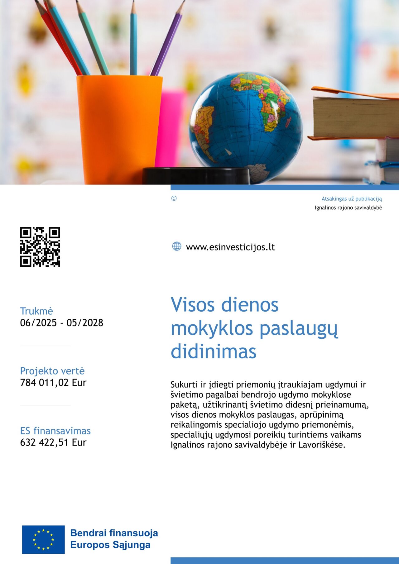 Ignalinos rajono savivaldybės administracija 2025 m. birželio 5 d. pasirašė projekto „Visos dienos mokyklos paslaugų didinimas Ignalinos rajono savivaldybėje ir Lavoriškėse“ (toliau – Projektas) įgyvendinimo sutartį su VšĮ Centrine projektų valdymo agentūra dėl projekto finansavimo iš Europos fondų lėšų, Bendrojo finansavimo lėšų ir nuosavo savivaldybės įnašo.